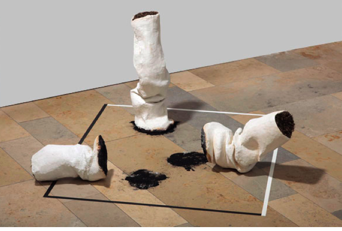 Straucheln und Kippen, Gips, Heu, Holzkohle, Gewebwband schwarz und weiß